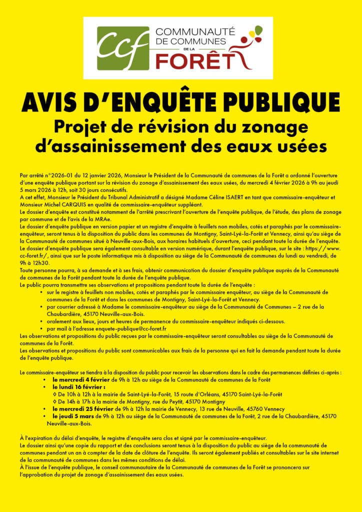 La Communauté de communes de la Forêt organise une enquête publique relative à la révision du zonage d’assainissement des eaux usées.